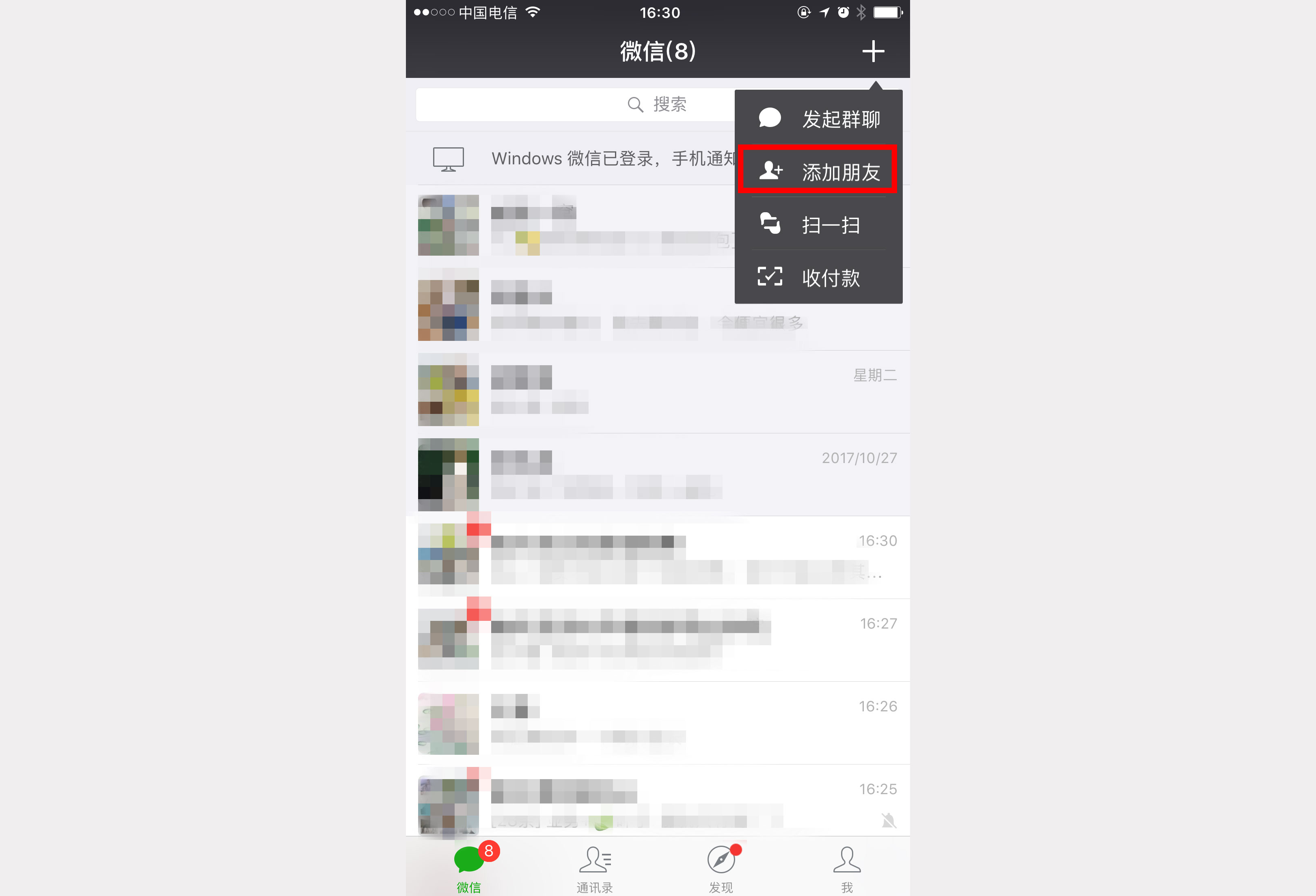 1.1、 打开手机微信首页,点击“添加朋友”