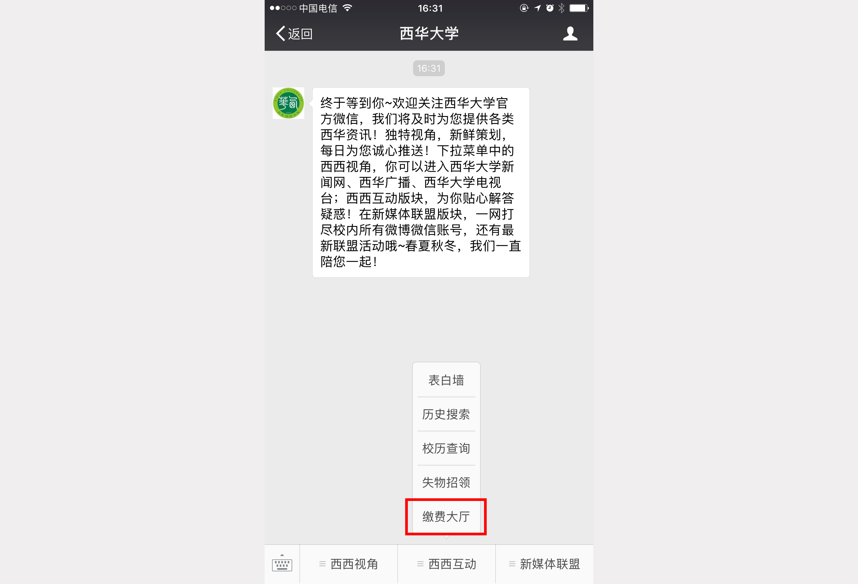 1.5.进入公众号主界面,点击菜单进入“西西互动”?“缴费大厅”