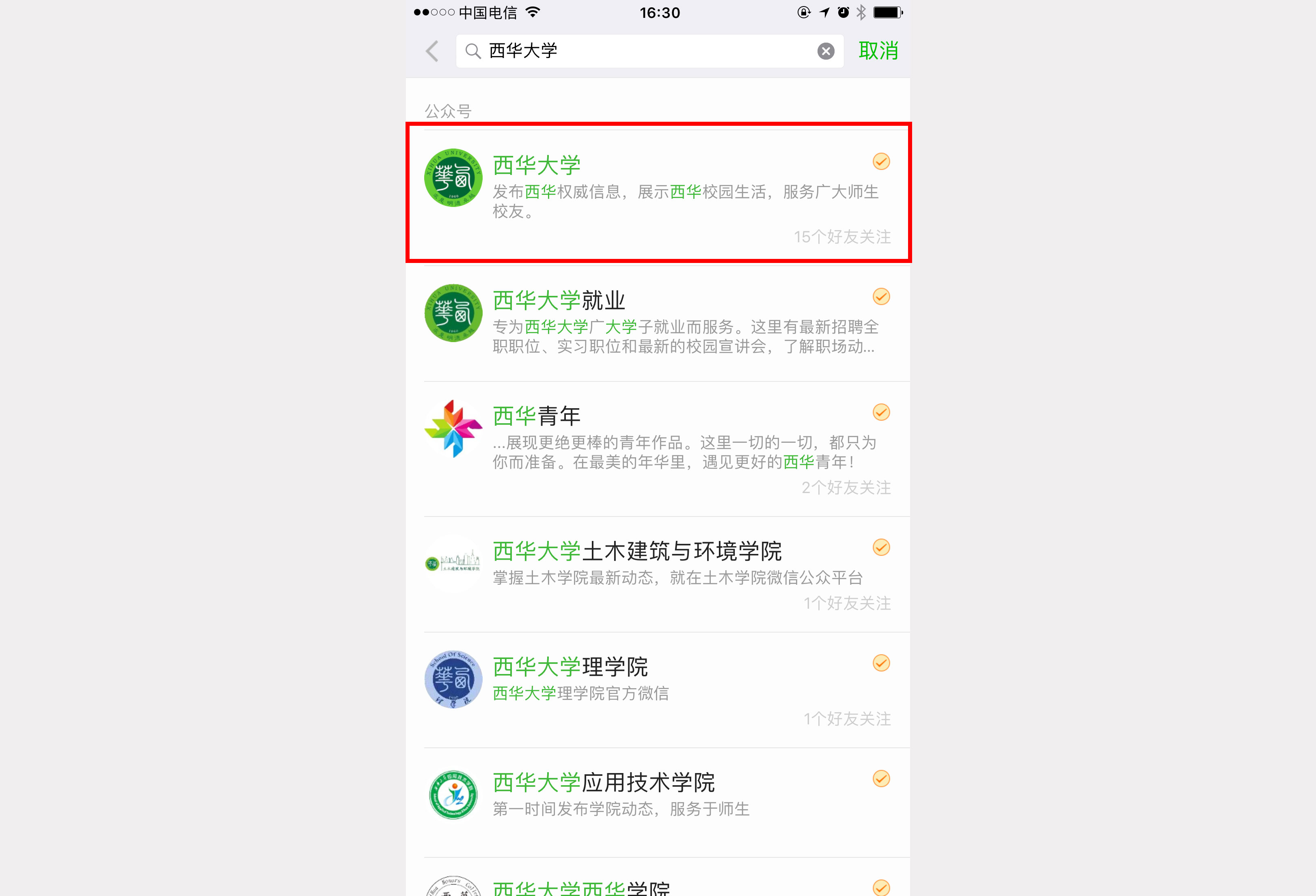 1.3、 从搜索结果中选择西华大学公众号,点击进入