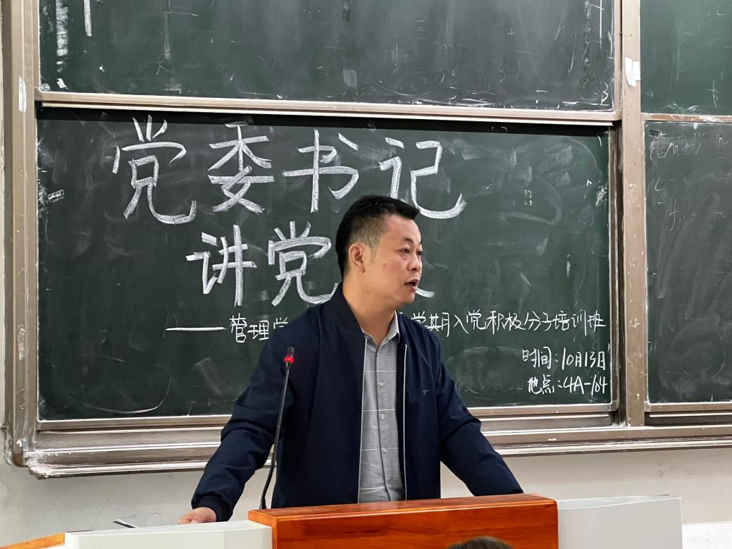 党课开始前,全体成员起立齐唱《国际歌》。随后,班长夏珍为大家讲解了课堂注意事项、听课要求及课程安排。在热烈的掌声中,管理学院党委书记肖东华上台为大家授课。上课初始,肖东华书记从自身上党课的经历、感悟引入,向同学们强调端正入党动机的重要性并牢记入党初衷的必要性。坚守初心使命,践行立德思想。肖东华书记号召同学们将习近平总书记的话常存心间,要坚定不移听党话、跟党走,立志做有理想、敢担当、能吃苦、肯奋斗的新时代好青年。课堂上,肖书记以自己的亲身经历进行分享并与同学们互动交流,同学们全神贯注,认真听讲,积极回应。最后,在大家热烈的掌声中,本次党课圆满结束。