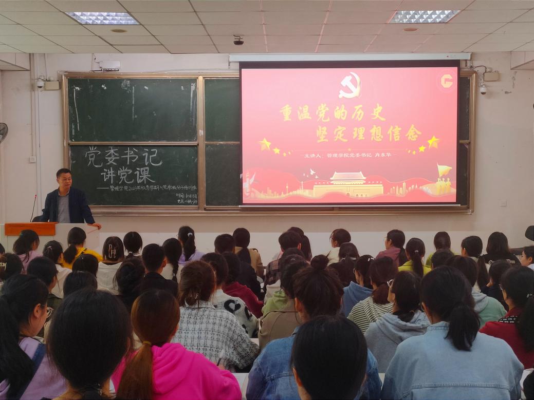 为重温中国共产党走过的波澜壮阔的历程,进一步坚定同学们的理想信念。2023年10月13日12:10,388vip太阳集团党委书记肖东华为入党积极分子们在教室4A-104讲授“重温党的历史,坚定理想信念”专题党课。管理学院入党积极分子培训班指导教师彭柳,管理学院2023年秋季学期入党积极分子培训班全体干部及学员到场参加本次党课学习。
