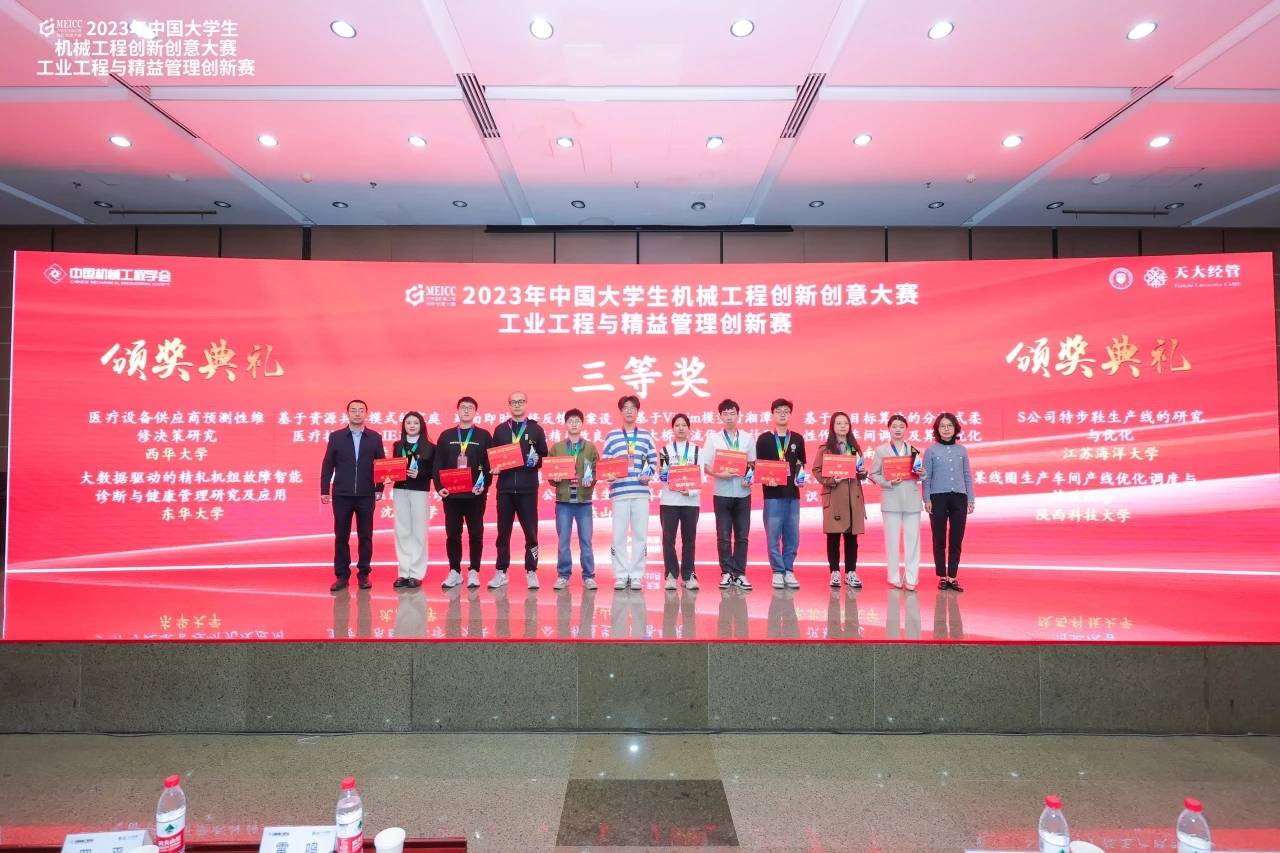 2023年10月21-22日,由中国机械工程学会主办,天津大学管理与经济学部、中国机械工程学会工业工程分会承办的2023年中国大学生机械工程创新创意大赛工业工程与精益管理创新赛(全国总决赛)在天津大学成功举办。我校管理学院工业工程专业肖小铃、陈佳丽、王相林组成的参赛代表队(指导教师:黄国栋)经过顽强拼搏和团结合作,荣获全国三等奖。