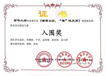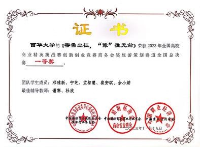 为提高我院学子商业创意能力,让西华大学学子获得更多的实践经验和机会,我院积极组织学生参与全国商业经营挑战赛(创新创业赛)。在11月19日结束的河南三门峡市举办的全国商业精英挑战赛创新创业赛(会奖旅游策划赛道)总决赛中,我院物流专业学子邓雅新、宁芝、孟智慧、崔安琪、余小娇组成的众程旅游策划有限公司队在指导老师谢寒、杜欣的精心指导下以作品“蜜雪出征,“豫”往无前”勇猛夺魁,喜获全国一等奖的好成绩,同时入围新加坡商业活动策划大赛。两位指导老师也获得了“最佳辅导教师”称号。