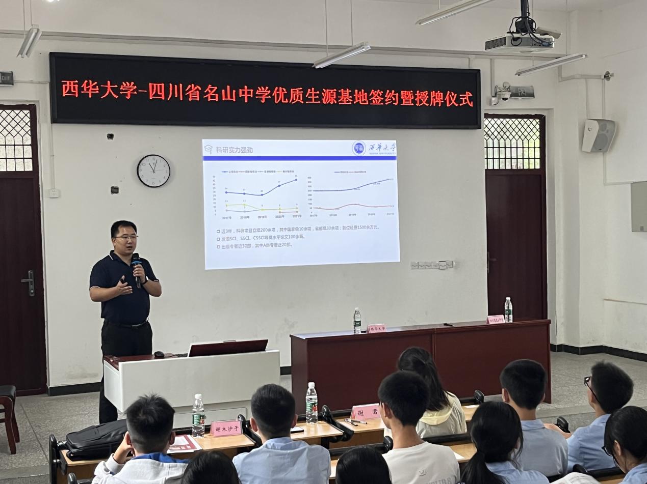 名山中学党委书记、校长李详、文庙校区执行校长张军奎谢书记一行表示了热烈的欢迎,校长带领我院一行参观了名山中学,介绍了学校的历史沿革和基本情况。随后,在学校会议室举行了招生宣讲,并举行了“优质生源基地”授牌仪式。学院工商管理系主任丁灿详细地介绍了西华大学的概况和办学优势,也让高中生对我院的专业有了更加直观的了解。讲座过程中,同学们掌声不断,与老师们积极互动,现场氛围良好。
