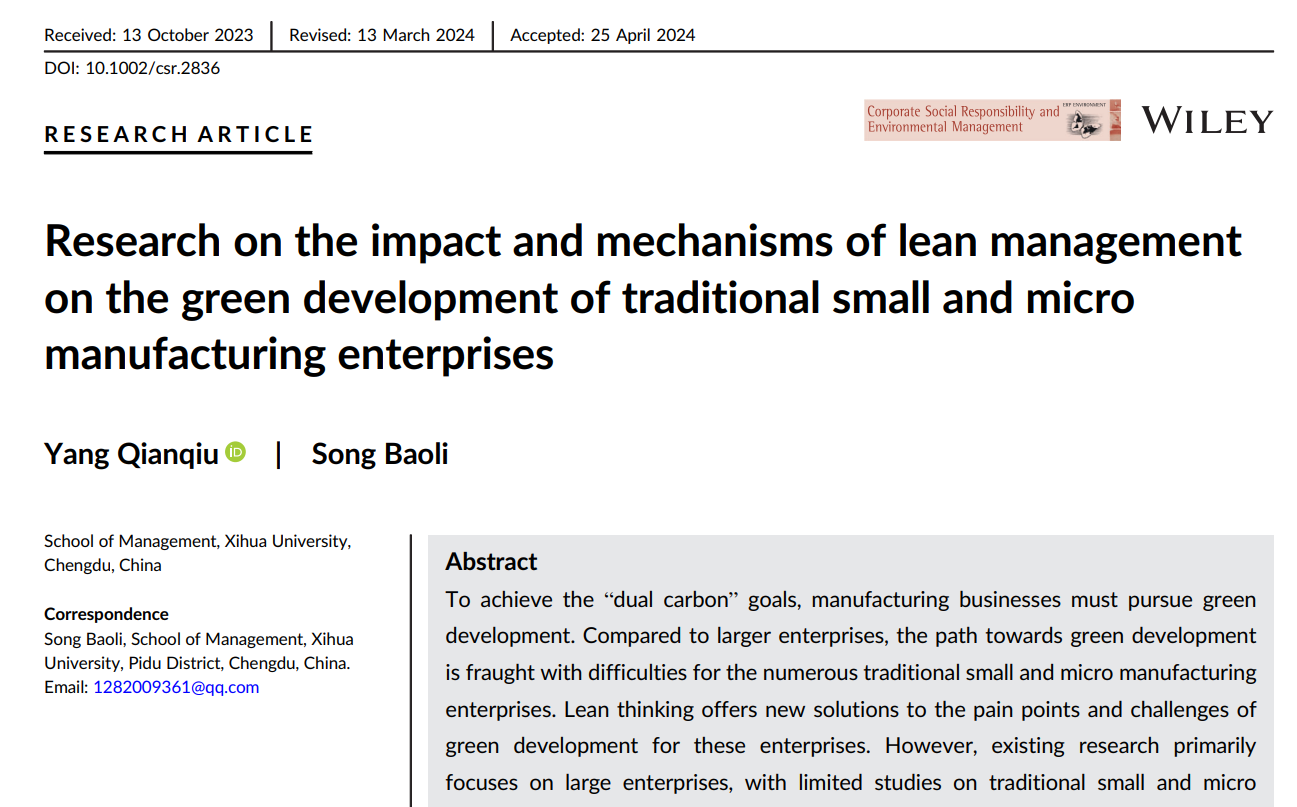 近日,管理学院宋宝莉教授与其指导的硕士研究生杨倩秋的论文“Research on the impact and mechanisms of lean management on the green development of traditional small and micro manufacturing enterprises”在国际知名期刊Corporate Social Responsibility and Environmental Management(SSCI,IF=9.8,JCR一区)发表。论文以传统中小微制造企业为研究对象,构建了传统中小微制造企业精益绿色发展机理模型,并搜集相关企业的数据进行了验证。研究结论对于拓展精益绿色发展相关研究以及传统中小微制造企业突破绿色发展困境具有一定的理论价值和实践意义。