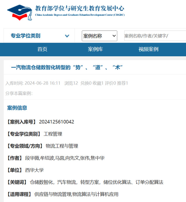 自2023年7月案例征集和评选工作开始,管理学院积极组织专业教师进行案例撰写。段华薇教授主持撰写的教学案例——《一汽物流仓储数智化转型的“势”、“道”、“术”》,先后经过多次案例企业实地调研、撰写、初审、修改、再审等努力,不断对案例内容进行完善,对案例编写进行有效规范,最终成功入选中国专业学位教学案例库。未来,管理学院将进一步推进专业学位研究生教学案例编写和案例库建设工作,继续深化专业学位研究生培养模式改革,有效推动专业学位研究生培养质量不断提高。