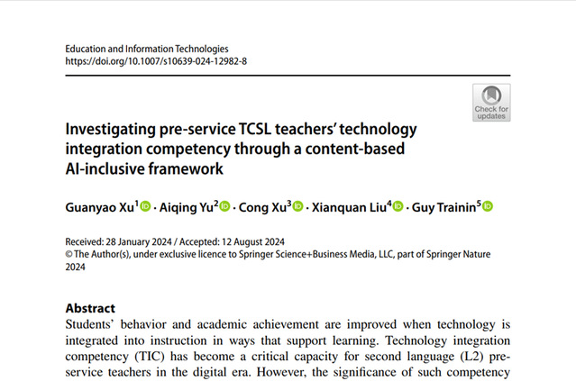近日,管理学院教师徐冠尧在SSCI JCR一区期刊《Education and Information Technologies》发表了名为“Investigating pre-service TCSL teachers' technology integration competency through a content-based AI-inclusive framework”的研究论文。该期刊在“教育与教育研究” 学科中的排名为16/756,是教育研究领域的顶级刊物之一。本研究除了涉及数据挖掘方法以外,同时也涵盖了教育改革内容。