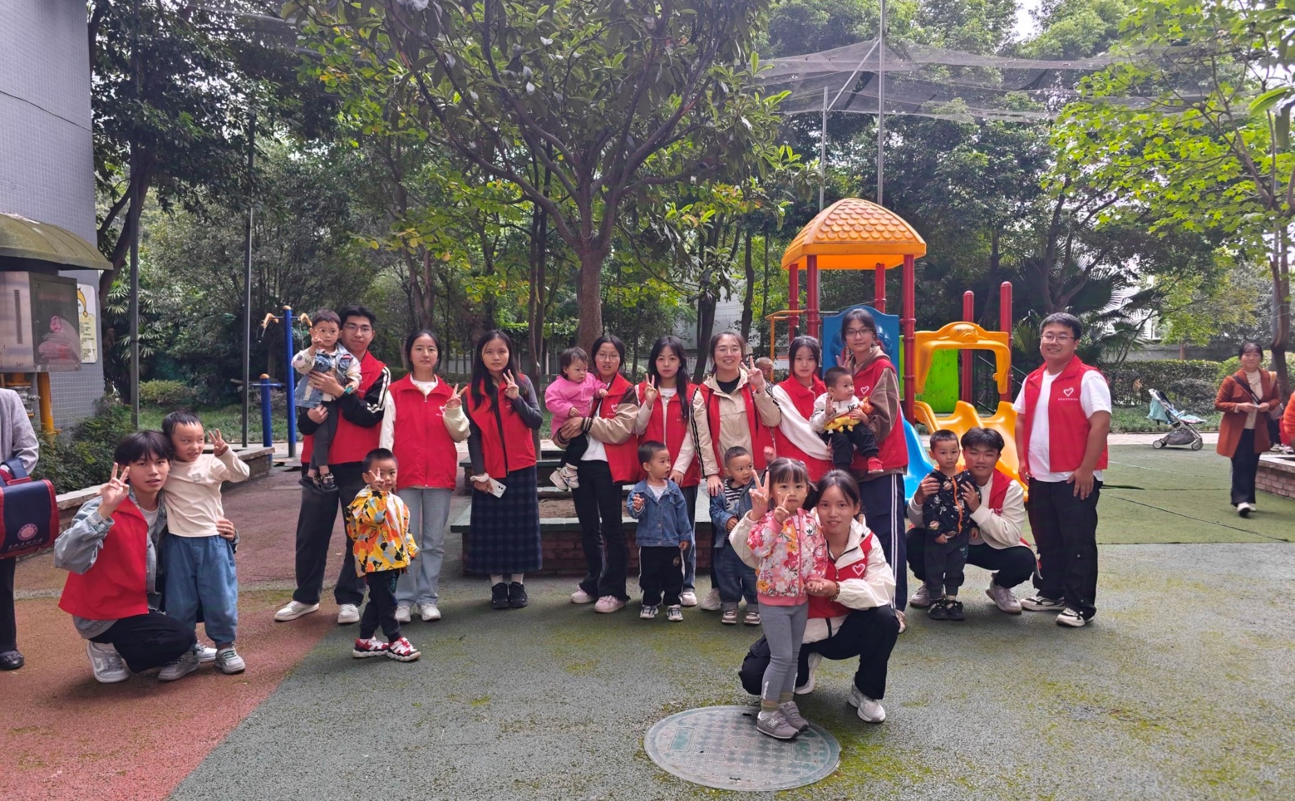 下午四点,志愿者们来到了社区,这时候大部分小朋友还没有放学,只有几个小朋友在室外游乐区域玩耍,志愿者们与他们进行了互动,并照看他们在滑滑梯上玩耍。随着时间的推进,小朋友们逐渐增多,他们有的喜欢搭积木,有的喜欢室外滑梯,也有“黏”着志愿者不放的……在小朋友们玩耍的过程中,有那么几个比较活泼的孩子,不停的在树下刨着土,嘴边不断说着要挖宝藏。也有几个比较安静的小朋友,在室内专心地拼着积木,拼装着一个又一个不同的图形。整个活动过程中,志愿者们细心地陪伴呵护着小朋友们,与他们一起沉浸在快乐当中。