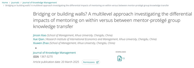 2025年3月20日,管理学院数智化人力资源管理研究团队在管理学领域SSCI一区期刊《Journal of Knowledge Management》发表题为“Bridging or building walls? A multi-level approach investigating the differential impacts of mentoring on within- versus between-group knowledge transfer”的研究论文。中文题目为:搭桥还是筑墙?采用多层次方法探究指导对组内和组间知识转移的不同影响。该论文由管理学院肖金岑副教授和赵修文教授指导,通讯作者为国际经济与管理研究院2022级研究生钱雪。