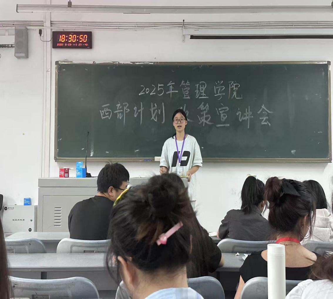 为响应党和国家号召,鼓励更多青年学子投身西部和基层建设,2025年4月23日,管理学院在5B-212教室成功举办了2025年西部计划政策宣讲会。2021级毕业生代表与低年级学生干部参加此次宣讲,管理学院团委学生会执行主席罗江莹主讲。