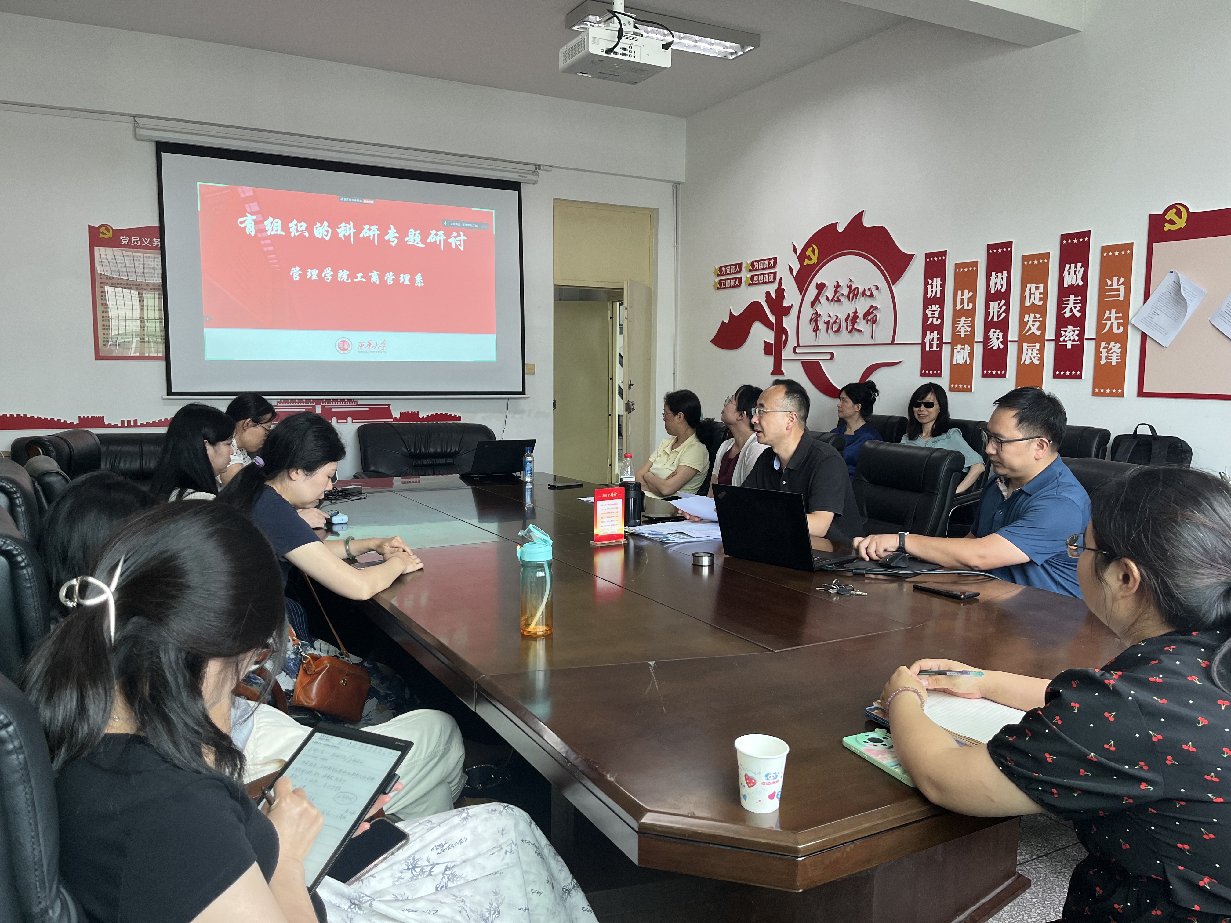 6月25-26日,管理学院召开有组织科研专题讨论会。学院副院长牟绍波教授先后到宜宾校区、管理工程系、会计与财务系、工商管理系,与系上教师交流,共探学院有组织科研的新路径。会上,牟绍波副院长指出,有组织科研是推动学院学科高质量发展的关键引擎,需聚焦国家战略与区域经济社会发展需求,紧紧围绕工商管理一级学科下设的四个二级学科(企业管理、会计学、技术经济及管理、人力资源),整合优势资源,组建有组织科研团队。各位老师们围绕当前科研方向、团队建设、国家基金项目申报、高水成果发表等问题展开热烈讨论,并分享了在科研合作中的经验与挑战,并就如何优化科研激励机制、加强团队建设提出了宝贵的建议。
