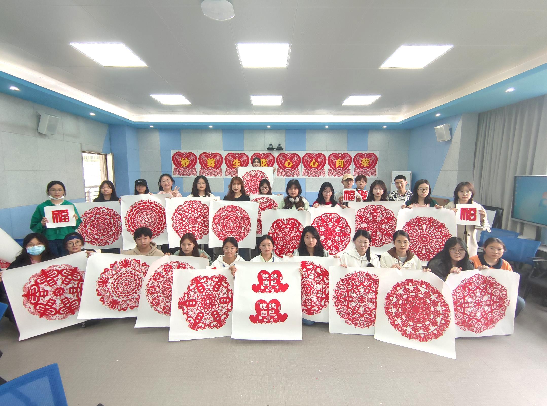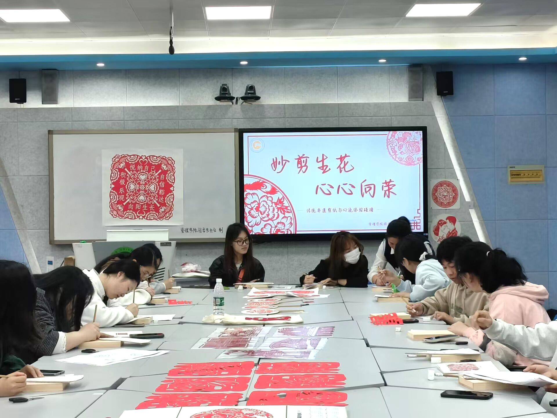 关注心理健康,从你我做起。为宣传心理健康知识,缓解学生压力,引导大学生将积极心态与艺术创作紧密结合。管理学院2023年4月1日开展了以“妙剪生花,心心向荣”为主题的心理健康教育宣传剪纸活动,意在将传统非遗剪纸与心流体验相结合,引导大学生养成积极向上的心理状态,关注自我情绪。管理学院心理指导教师钱璐宜、剪纸指导教师、心理委员及剪纸爱好者参与本次活动。