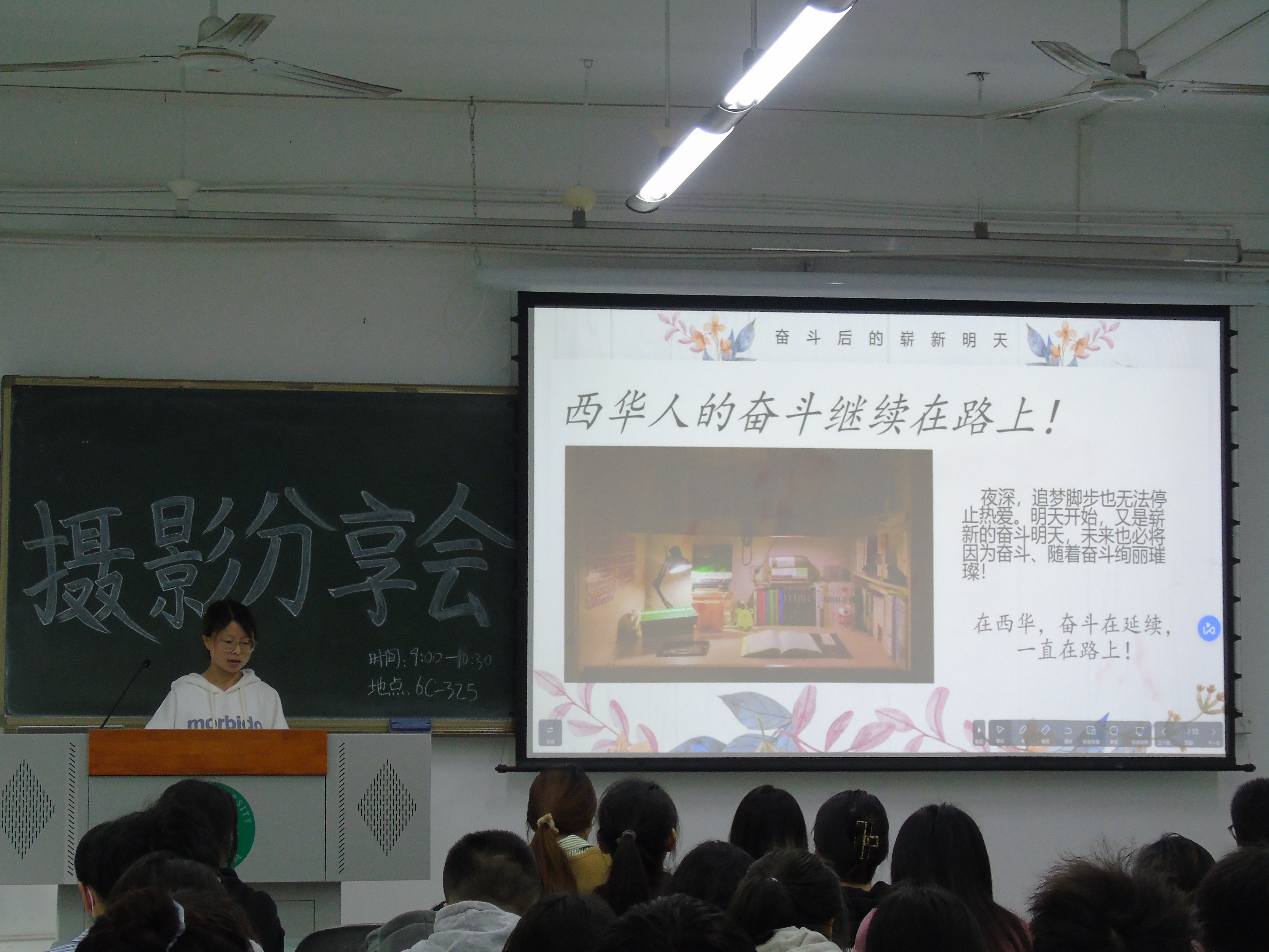 活动开始,主持人为大家讲解活动主题及评分标准,公布投稿环节评选出的优秀作品。随后,入围同学进行优秀摄影作品分享。有同学分享做志愿者的经历;有同学分享高三的奋斗岁月与拼搏时光;还有同学分享自己从榜样中学习到的奋斗精神……最令人动容的是,有位同学分享的是来到西华大学后对于奋斗的感悟,他表示看到教室里的莘莘学子、看到升旗手夜以继日的训练、看到图书馆奋笔疾书的考研人都会让他感受到奋斗的力量,奋斗无处不在,也正是奋斗的精神指引着他寻找心中的希望。同学们的分享非常精彩,观看的同学也意犹未尽,在一次次热烈的掌声后,分享环节落下帷幕。紧接着,评委经过讨论评选出一、二、三等奖,评委们分别为他们颁发奖品。在同学们的欢笑笑语中,全体成员合影留念,本次分享会圆满结束。