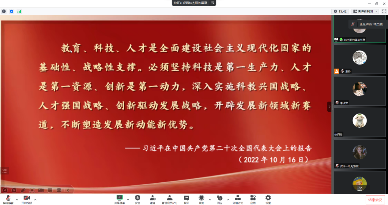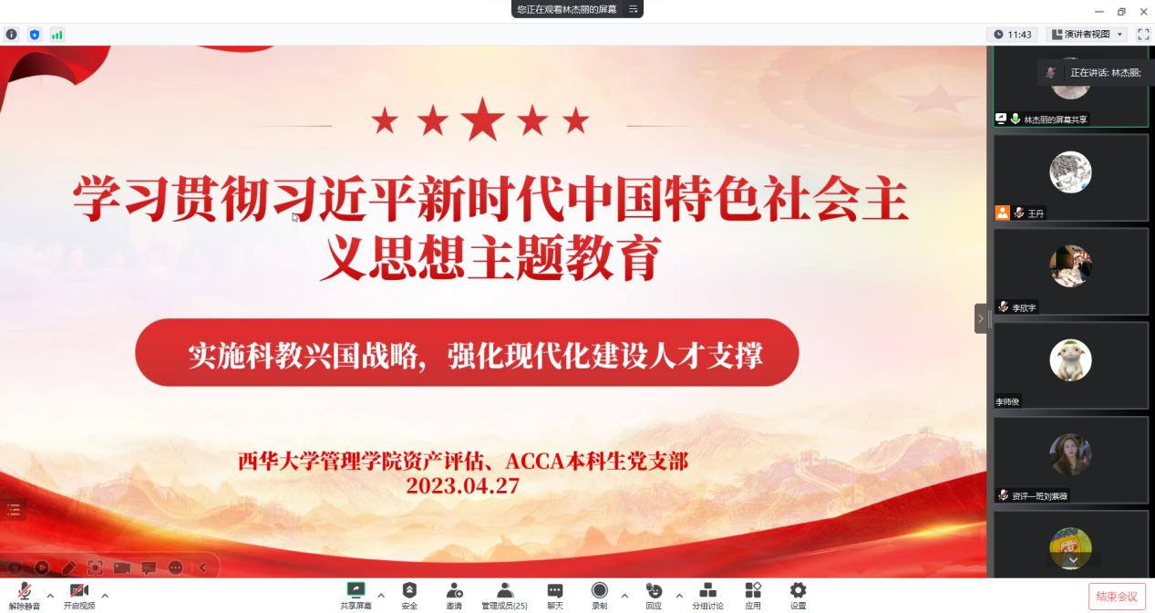 2023年4月27日12:15,资产评估、ACCA本科生党支部利用线上腾讯会议开展了学习贯彻习近平新时代中国特色社会主义思想主题教育集中学习会,重点围绕“实施科教兴国战略,强化现代化建设人才支撑”展开学习。