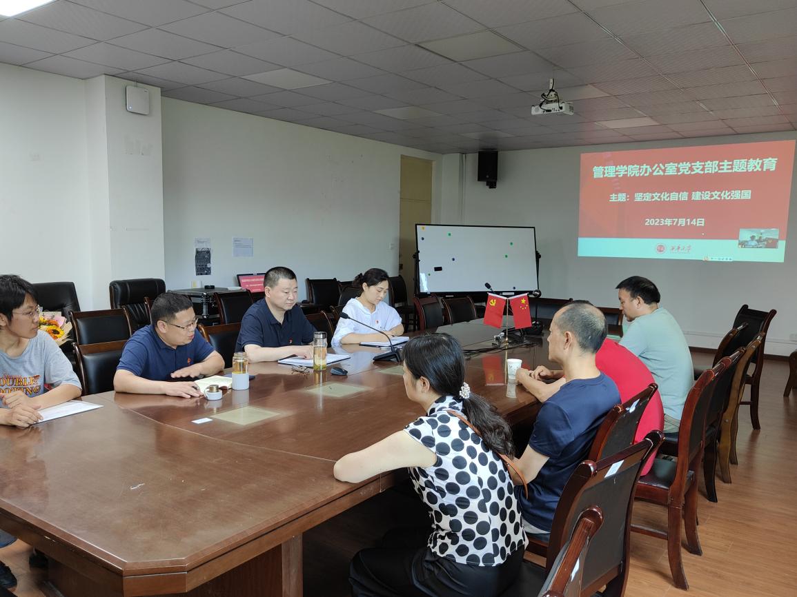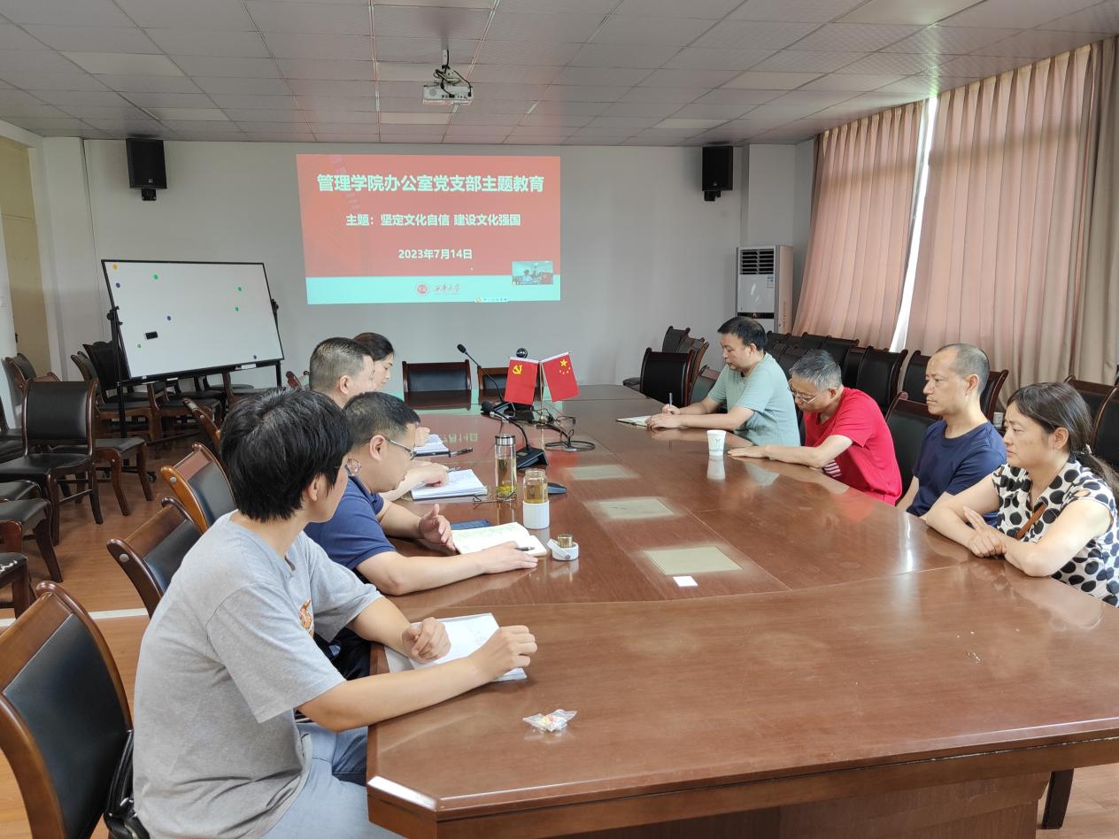 7月14日下午,管理学院办公室党支部采用线上、线下结合的方式开展学习习近平新时代中国特色社会主义思想主义教育集中学习,围绕“坚定文化自信,建设文化强国”开展专题研讨。会议由党支部书记饶芳同志主持,办公室党支部全体党员及学院党委委员姚世斌同志参加了学习。